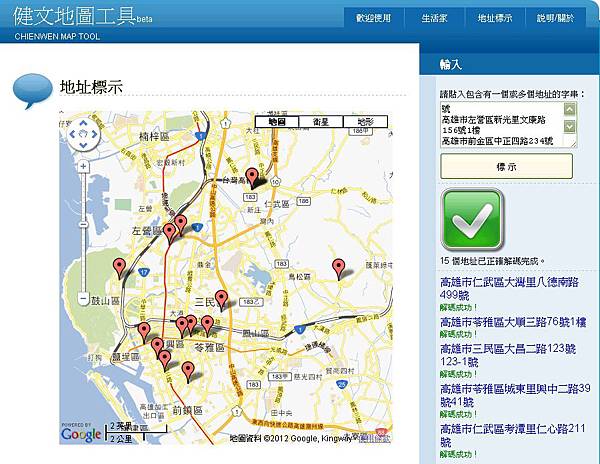這個工具的介面很直覺,只要把多筆地址以換行區隔填入右上方的方框